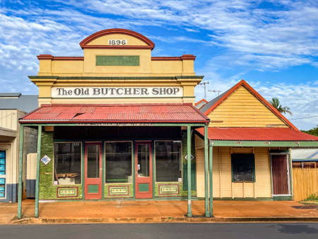Facade of The Old Butcher Shop, built from 1896 to 1902. It includes the formar brick butcher shop and an adjoining timber shop. In Childers, Bundaberg Region, Queensland, Australia