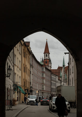 Munich, Germany - Dec 21, 2023 - The Old Town building (Altes Rathaus) Hall and Old buildings on the east side of Marienplatz in the city centre of Munich. View from under the bridge, Space for text, Selective focus.