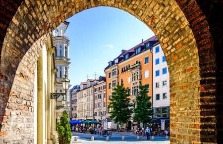 Munich, Germany - August 10: historic buildings at the old town of munich - Sendlinger strasse on August 10, 2021