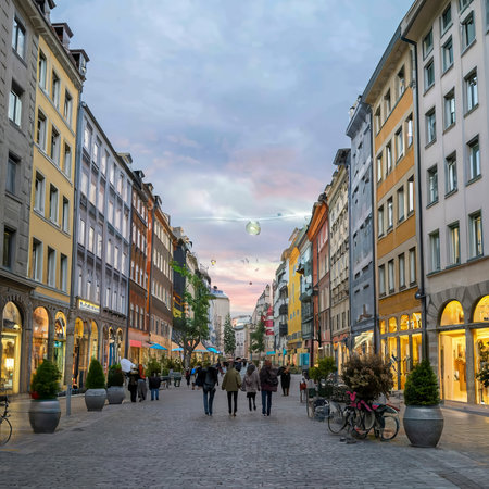 People are walking though a shopping street towards Marienhof in Munich at the Evening, Germany