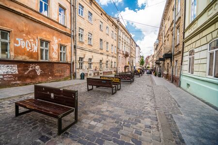 Lviv, Ukraine - July 19, 2019. Cobblestone street in the historic center of Lviv. Street scene. Streets and architecture of the old city.