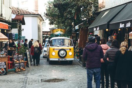 Istanbul, January 15, 2020: Legendary yellow hipster or hippie minivan Volkswagen rides on city street.