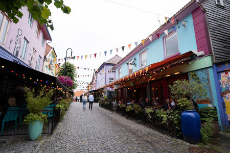 Stavanger, Norway - August 6, Norway: Fargegaten, also known as Øvre Holmegate, a vibrant and colorful street located in Stavanger, Norway. It is famous for its picturesque atmosphere with cafes, shops, and galleries