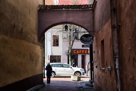 Vilnius, Lithuania - April 04, 2018: View of the old courtyard from the dark corridor.