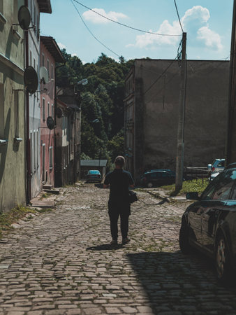 man walking by the pavement street of the old town, view from behind