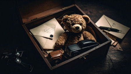 A wooden table topped with toys and a teddy bear. Generative AI image.