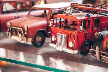 Model of retro fire engine or fire track on the shelf. Miniatures of colorful vintage vehicles in the shop. Turkey, Istanbul, 2019-08-18