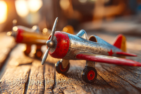 An antique metal aircraft model rests atop a rustic wooden table, basking in the golden glow of sunset, evoking nostalgia and timeless childhood adventures.