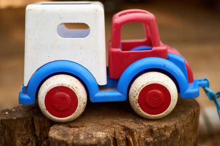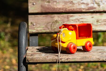 Funny yellow plastic toy car with a rope forgotten on a weathered park bench on a sunny summer day