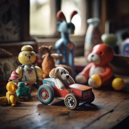 retro wind-up toys scattered on a table, created with generative ai