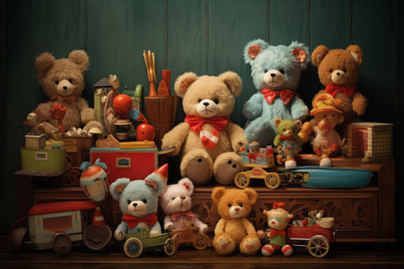 Colorful Collection of Vintage Toys Including Popular Action Figures and Teddy Bears in Nostalgic Setting