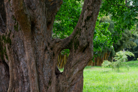 The textured bark of a tree trunk stands out against lush green grass in the park. A close-up of a large tree trunk with textured bark, set against a backdrop of green grass and a blurred park.