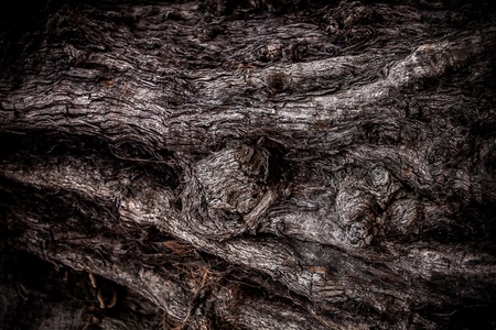 Dark brown dramatic photo of an old weathered stump. Wood nature background.