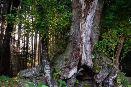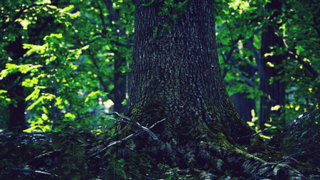 Vertical photo of an old tree in a green forest. Thick wide tree trunk.