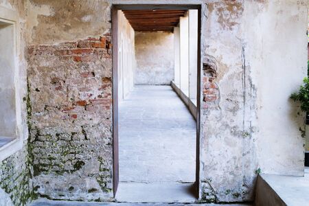 Close-up showing close-up of crumbling brick walls and plaster with cracks and arched openings. resolution use.