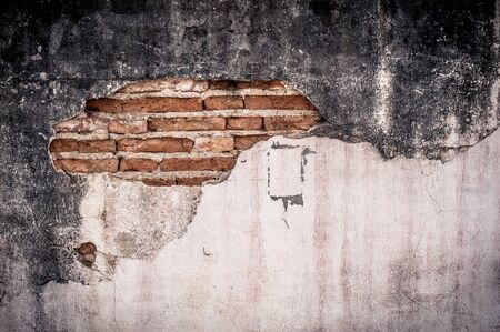 A broken brick wall with a hole showing a damaged plaster background. Grunge texture.