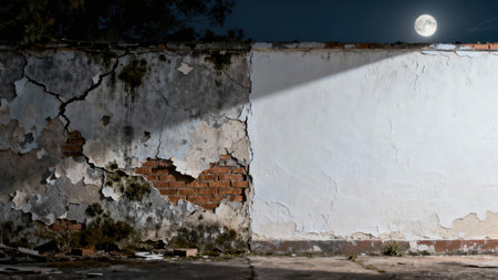 Dramatic nighttime photo showing the contrast between rough, cracked, exposed red brick and smooth, bright white textured plaster on an exterior wall illuminated by a celestial full moon.
