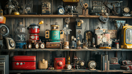 A nostalgic collection of vintage gadgets and appliances on a rustic wooden shelf, showcasing old-fashioned technology and retro design elements.