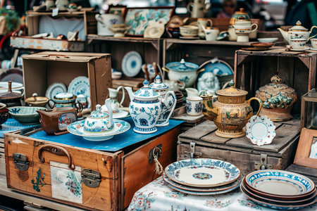 Stalls overflow with an array of antique dishes utensils and charming kitchen collectibles inviting discovery.
