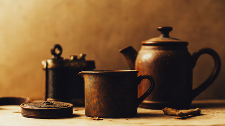 Atmospheric still life featuring traditional ceramic teapot and cup in warm brown tones with golden lighting. The rustic kitchen scene includes vintage pottery and creates a cozy, nostalgic ambiance perfect for concepts of comfort, tradition, and home cooking. Shallow depth of field emphasizes the handcrafted ceramic textures.