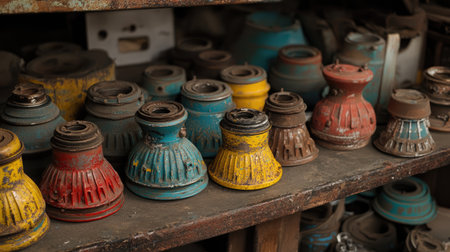 This image features a collection of vintage oil lamp nozzles in vibrant colors, displayed on a rustic wooden shelf, evoking a sense of nostalgia and craftsmanship.