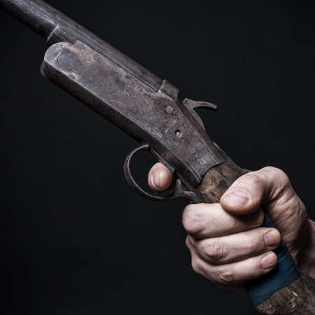 Vintage gun on the background of a burning fireplace. Selective focus.