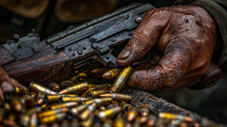 Gun and a bunch of bullets are on a table. The gun is a rifle and the bullets are in a pile. Scene is tense and serious, as it shows a weapon and ammunition