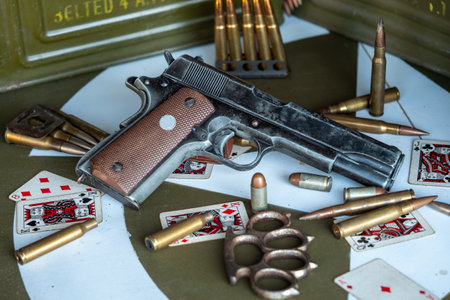 Gun is laying on a table with a pile of bullets and a deck of cards. The scene is chaotic and dangerous, with the gun and bullets suggesting violence
