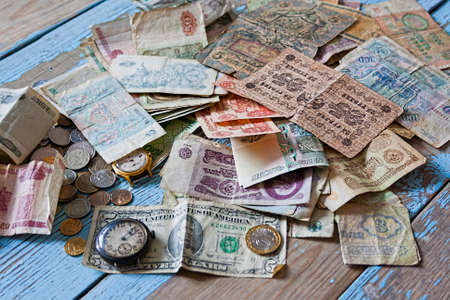 Money of different countries and different denominations, ancient money. Background.