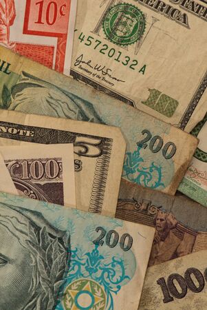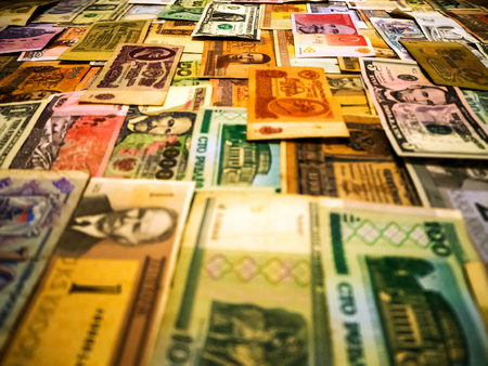 Colourful background of mixed banknotes from around the world