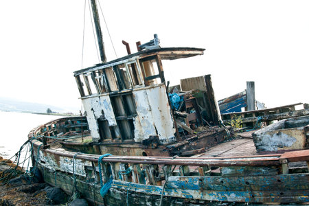 Derelict fishing trawler hauled up and rotting in a sea estuary