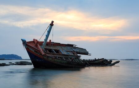 Old wrecked fishing boat in sea at dusk on coast of Ang Sila Village, Saensuk Sub-district, Chonburi Province of thailand. Suite for feelings of loss, disappointment, loneliness.