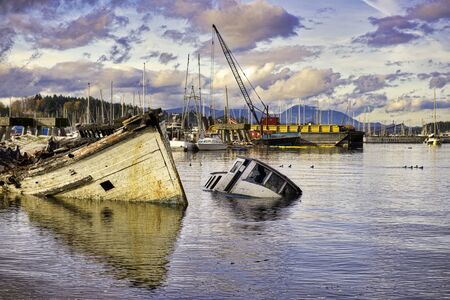 View of shipwreck on Ladysmith marina at sunset, taken in Victoria Island, British Columbia, Canada