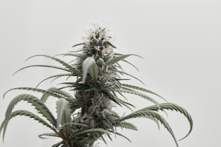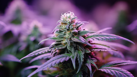 Marijuana plant in full bloom. Leaves are vibrant green. Depiction of the plant growth and development. Medical marijuana cannabis. Use of cannabinoids to treat diseases or relieve symptoms. AI.