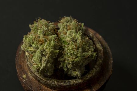 Dry marijuana bloom of ripened green flower in wooden grinder with black background
