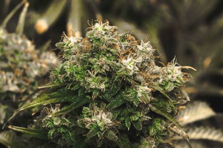 Flower bud of cannabis Satival in the greenhouse, marijuana flower bud background, herbal medicine. Concept of herbal alternative medicine, cbd hemp oil.