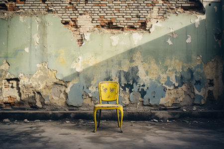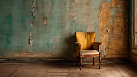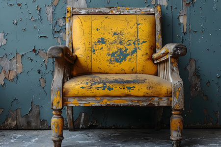 Vintage distressed yellow armchair with worn, chipped paint set against a wall with peeling blue paint. perfect for design, print, or poster, conveying themes of decay, history, and rustic charm. Generative AI