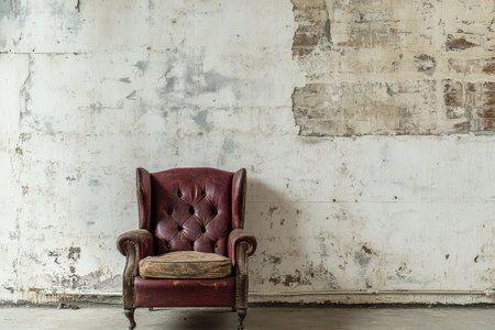 A worn red armchair sits against a weathered wall in an industrial space reflecting a rustic and nostalgic atmosphere.