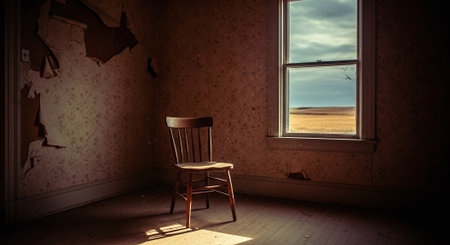Generative AI Image of Ancient Chair in Abandoned Scary Empty Room Near the Window