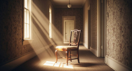 A solitary vintage wooden chair illuminated by warm sunlight, set against a textured wall for a timeless scene.