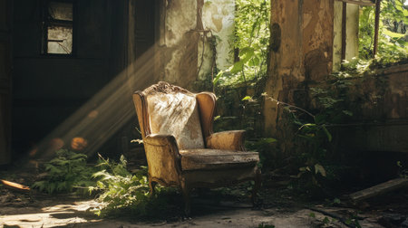 A weathered armchair sits alone in an overgrown room, illuminated by sunlight streaming through broken walls, surrounded by lush greenery and nature's reclaim.