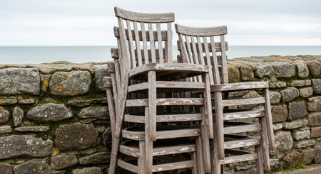 a wooden chair at the beach with dirt on its feet, showcasing a focus stacking technique. the chair appears pulled, scraped, and scratched, creating an interesting texture. the backlight enhances the organic texture of the wood. this ultra-high-definition (uhd) image captures the intricate details of the chair, showcasing the brilliance of the voigtlander lens used. ai generated