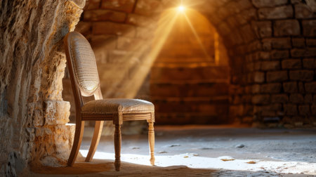 A single vintage chair rests in an abandoned stone cellar, illuminated by warm sunlight streaming through dark spaces, creating a serene atmosphere.