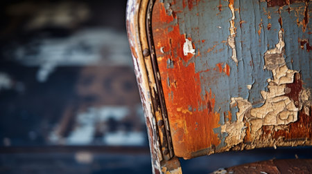 old metal chairs are captured in an intense close-up inside a refurbished theatre. the chairs showcase a textured paint layer in light indigo and orange, with torn and distressed edges. the varying wood grains add to the overall visual appeal. this detailed shot was taken using the tokina opera 50mm f/1.4 ff lens, highlighting the textural intricacies of the chairs. ai generated