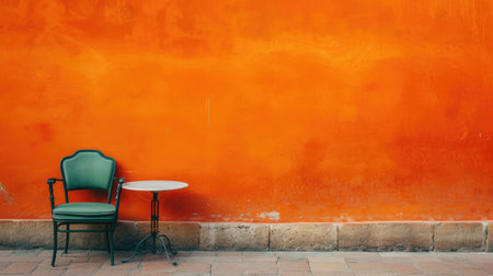 A chair and small table arranged before a lively orange wall, a stylish nook. Ai Generated