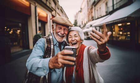 Happy Cheerful senior couple taking selfie on modern smartphone while standing on street. Concept of family, technology and elderly. Happy grandma and grandpa with modern technology copy space