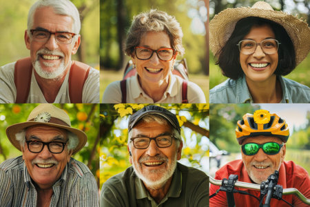 Diverse group of individuals, retirees, wearing hats and glasses, smiling and socializing outdoors, A montage of happy retirees enjoying leisurely activities