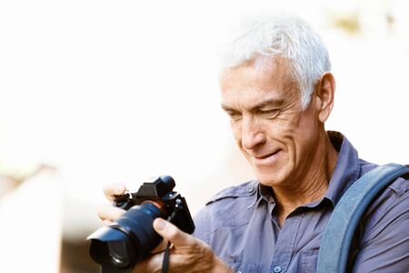 Everyone photogenic. Senior man taking selfie photo vintage camera. Self portrait. Memories in snap. Retro equipment for taking photo. Sharing his knowledge making good photo. Imitate fashion trends