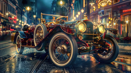 The handcrafted dashboard of a classic car featuring a of analog dials and glowing indicators reminiscent of a bygone era