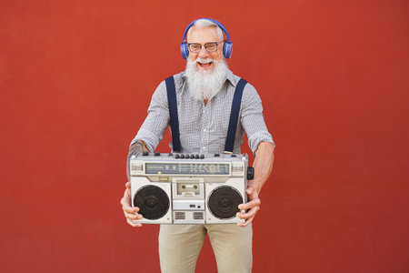 Happy senior man having fun listening to music with wireless headphones and vintage boombox outdoor